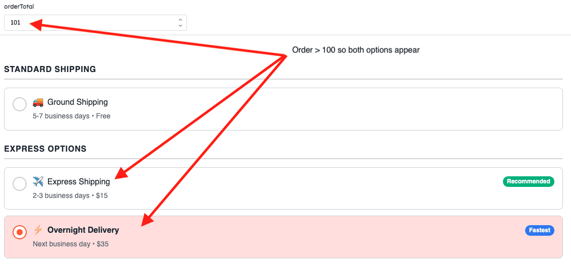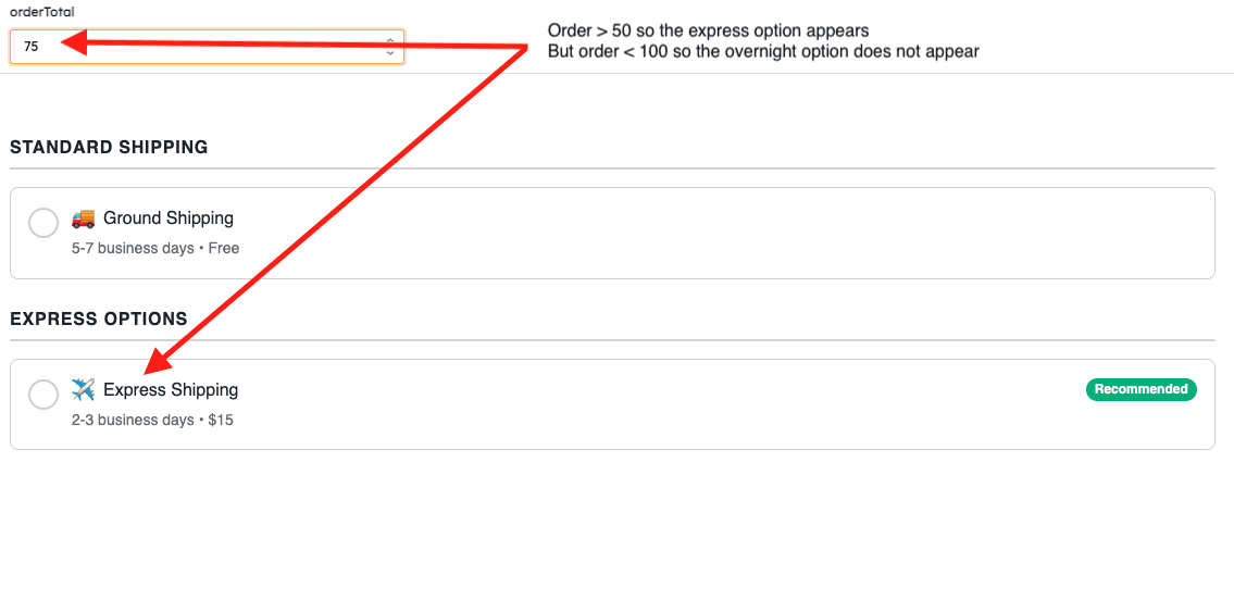 Imagine you're building a shipping method selector for an order management system. You have multiple carriers (USPS, FedEx, UPS, DHL), each with different service levels (Standard, Express, Overnight). Some options are only available for international orders, others only for domestic. Express shipping should only show for orders over $100, and you want to highlight the recommended option based on the delivery deadline.
