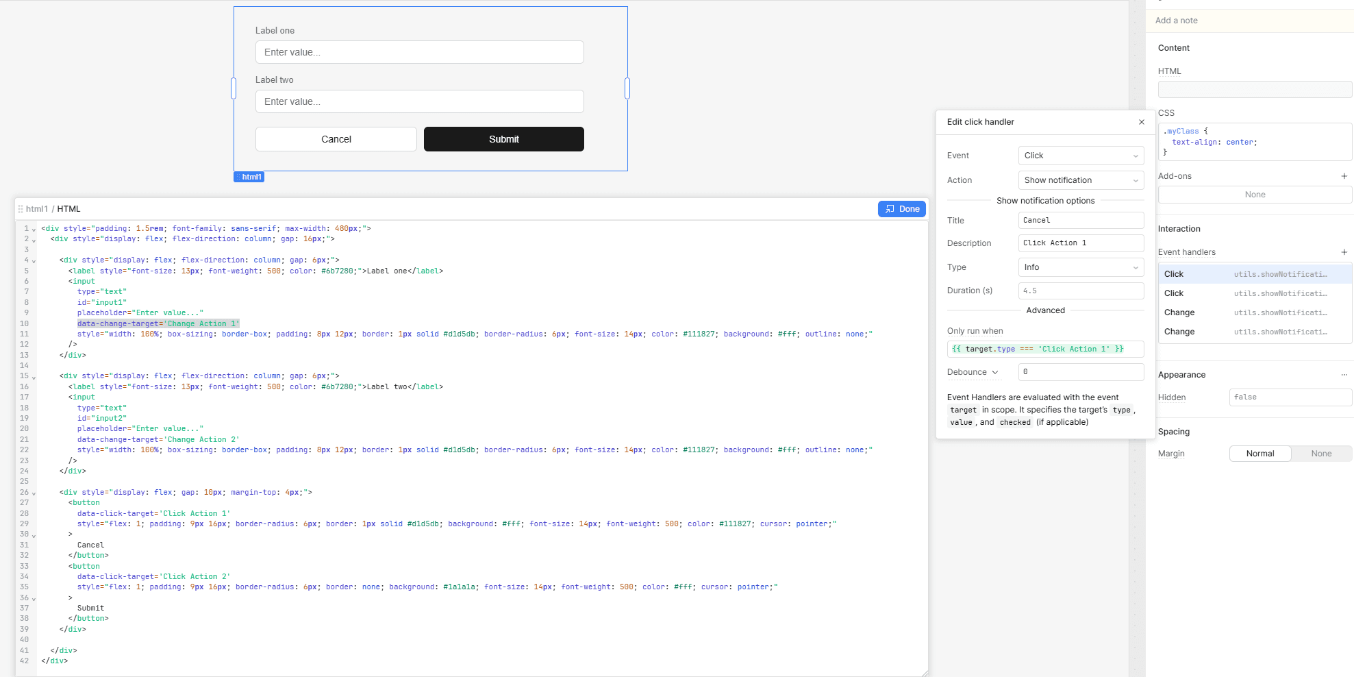 When you add interactive elements inside a Retool HTML component, the data-click-target or data-change-target attribute isn't optional, it's what makes event handlers work at all. Without it, handlers won't fire. With it, you assign each element a unique target value and use a condition in the "Only run when" field of each handler to control which one runs.